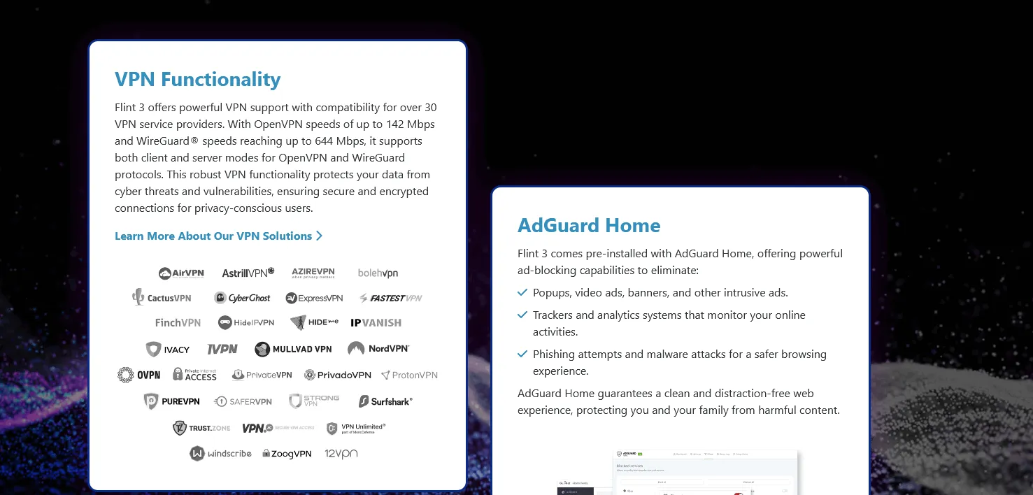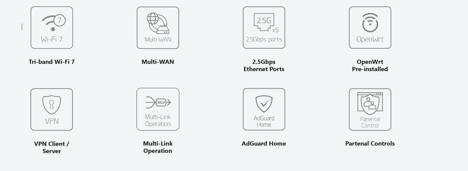 Flint 3 is our first Wi-Fi 7 home router, designed for home users and small offices. It delivers ultra-fast Wi-Fi 7 speeds, 5× 2.5G ports with 10Gbps aggregation, and robust VPN capabilities, along with AdGuard Home and Parental Controls. Flint 3 is built to meet the evolving demands of modern networks with efficiency and reliability.