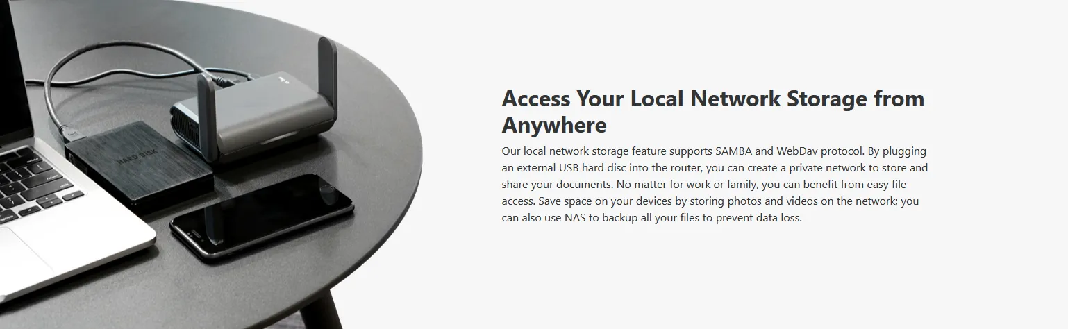 【Easy File Sharing】Our NAS feature supports SAMBA and WebDav protocol. By plugging an external USB hard disc into the router, you can create a private network to store and share your documents.
