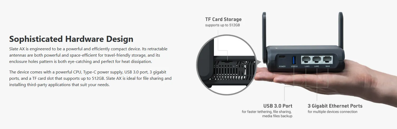 【Runs on OpenWrt 21.02】Slate AX runs on the latest OpenWrt 21.02 operating system (Kernel version 4.4.60), with mass device connection capabilities, and significantly reduced signal interference. You can customize the router and install applications based on your preferences.
