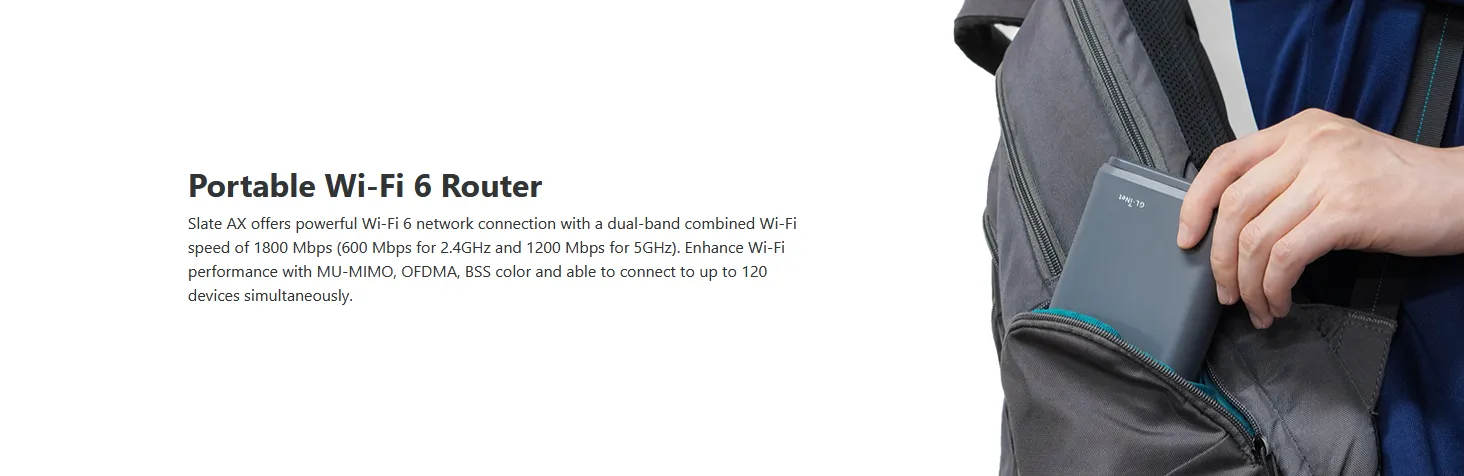 【AXT1800 WiFi 6 Wireless Router】Slate AX offers powerful Wi-Fi 6 network connection with a dual-band combined Wi-Fi speed of 1800 Mbps (600 Mbps for 2.4GHz and 1200 Mbps for 5GHz). Enhance Wi-Fi performance with MU-MIMO, OFDMA, BSS color and able to connect to up to 120 devices simultaneously.