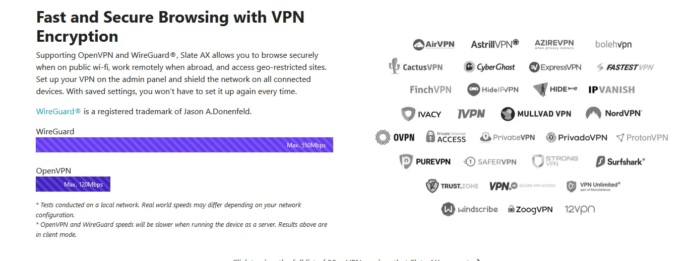 【Fast and Secure Browsing】IPv6 supported; OpenVPN & WireGuard pre-installed, compatible with 30+ VPN service providers, OpenVPN speed up to 120 Mbps; WireGuard speed up to 550 Mbps. Cloudflare encryption supported to protect the privacy.
