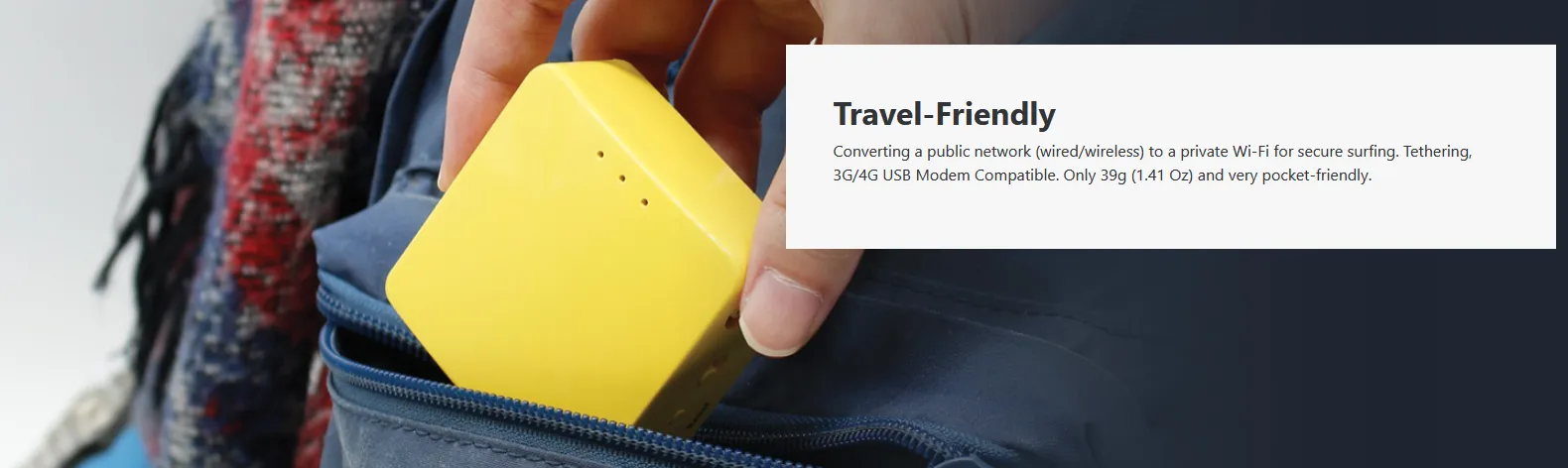 Meet Mango, a lightweight (39g) mini travel router for your next vacations or business trips. It is a stylish pocket WiFi that supports 30+ VPN service providers. It also comes with a pre-installed OpenWrt, which provides you with full customization. Its large memory & storage (DDR2 128MB & NOR Flash 16MB) is perfect for travel!