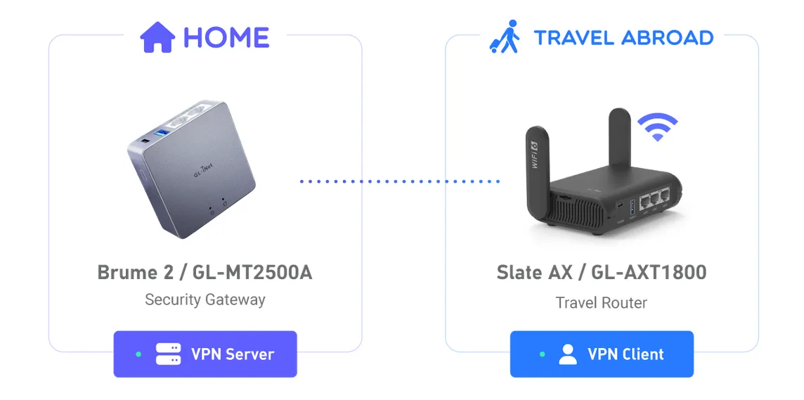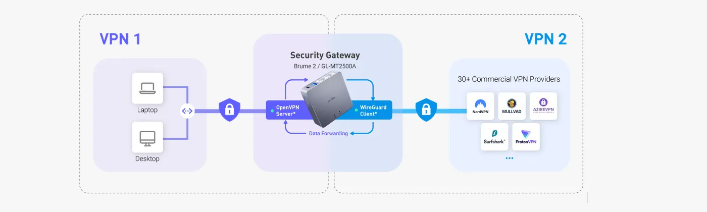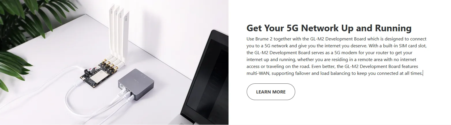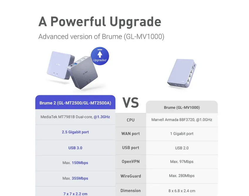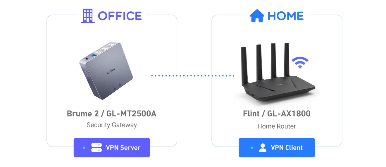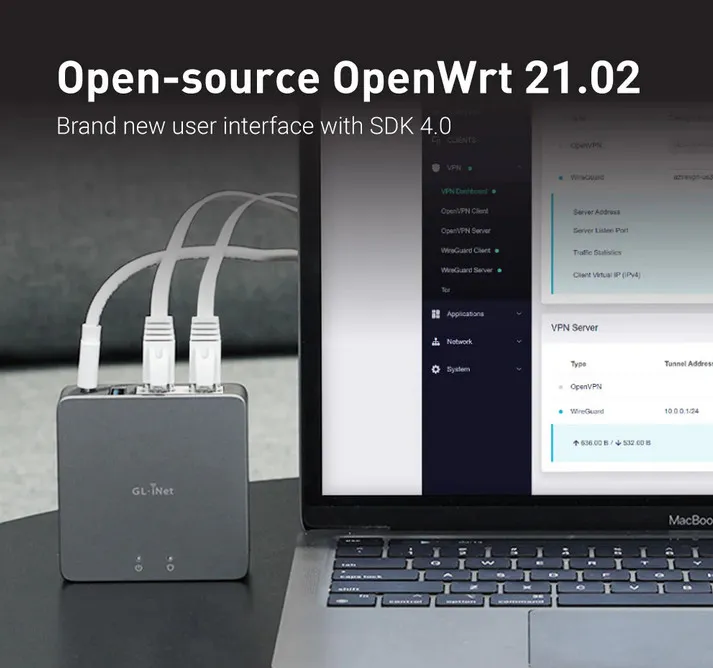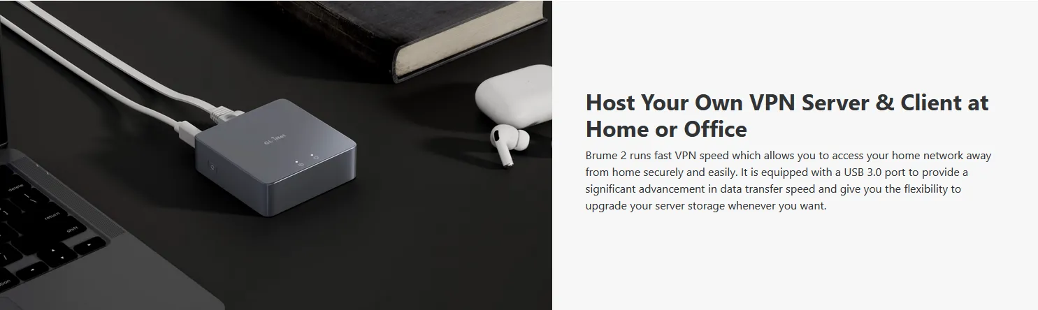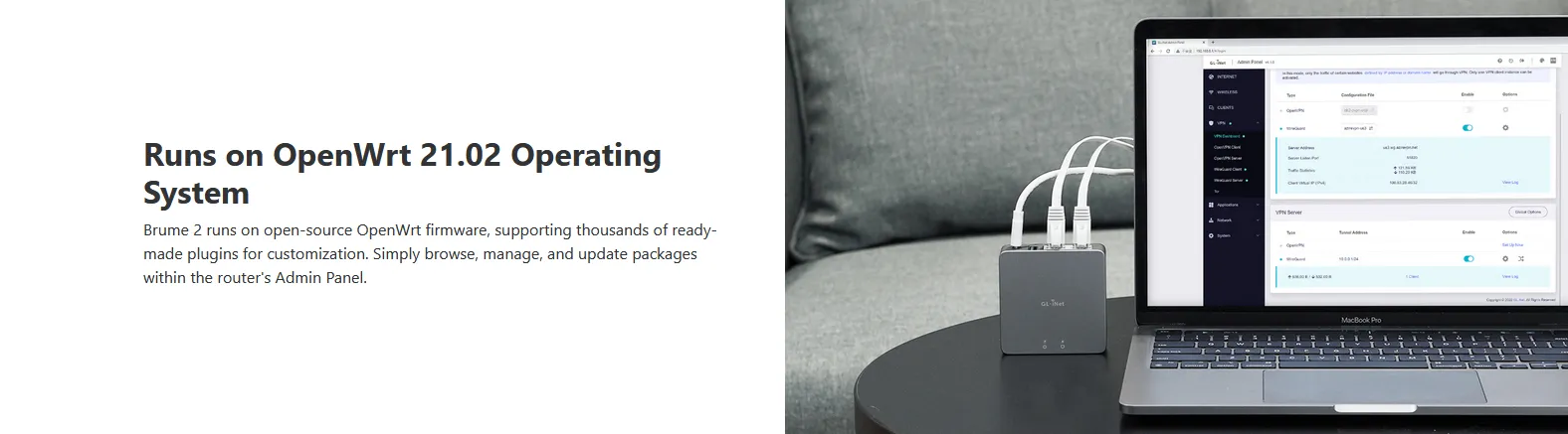 Powerful VPN Gateway for Home Office and Remote Work Brume 2 (GL-MT2500/GL-MT2500A) is a lightweight and powerful VPN Gateway that runs on OpenWrt v21.02 operating system. It is compactly designed to host a VPN server at home, or run SD-WAN (Site-to-Site) for small and medium-sized enterprises.