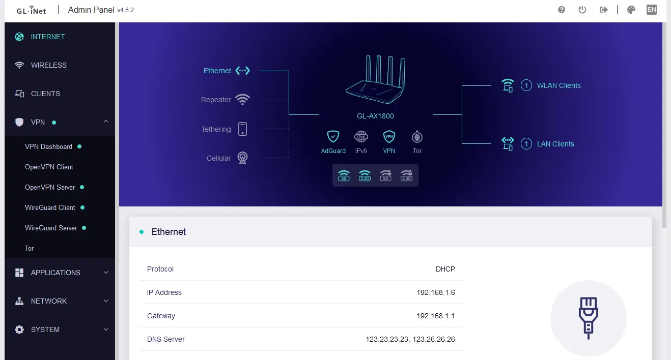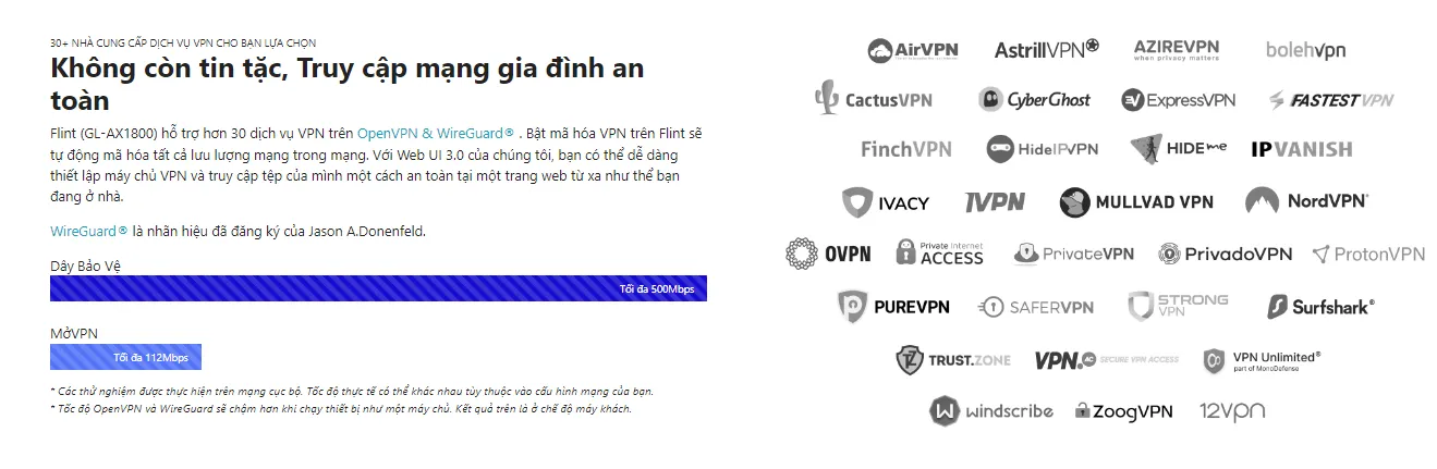 Thiết bị bán chạy trên Amazon. Bộ định tuyến GL.iNet GL-AX1800(Flint) WiFi 6 Router -Dual Band Gigabit Wireless Internet Router | 5 x 1G Ethernet Ports | Up to 120 Devices |VPN, OpenVpn&WireGuard, Tor. Hỗ trợ hơn 30 nhà cung cấp VPN. Phần cứng 1.2 GHz 64-bit Quad-Core CPU, 512 MB RAM, 128 MB flash storage