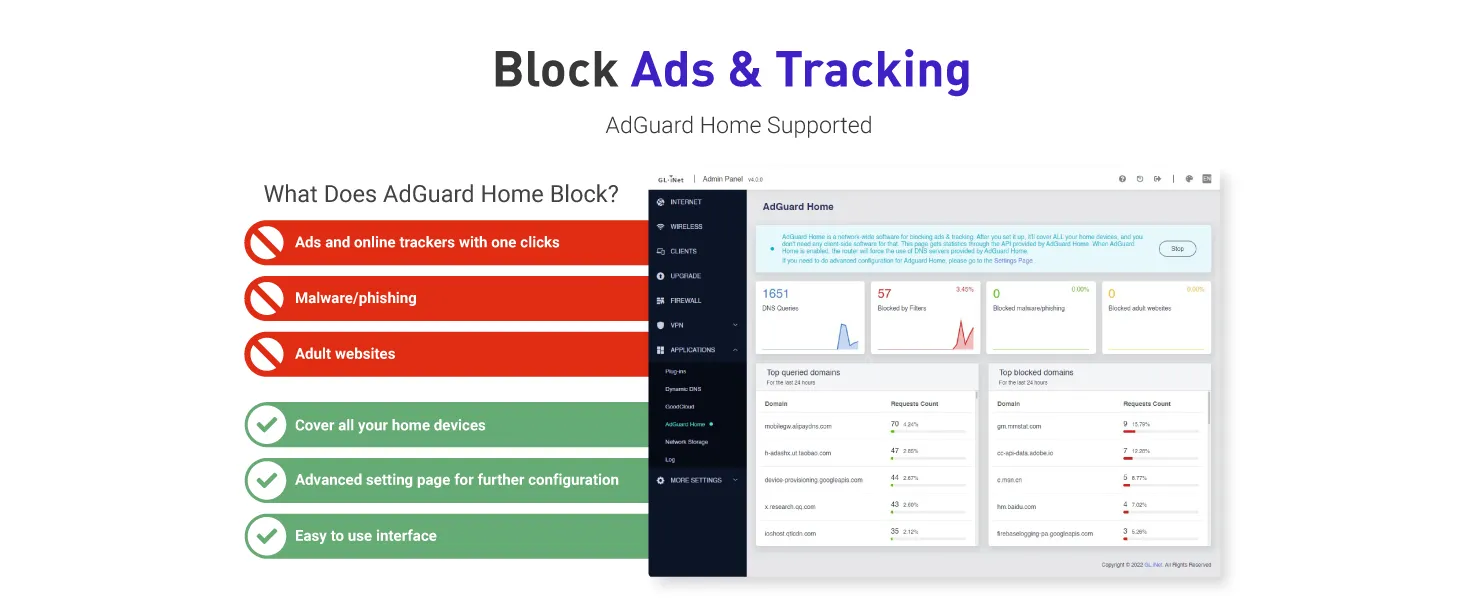 【AdGuard Home Supported】Enabling the use of a DNS server for blocking unwanted tracking and offers a convenient web interface for filtering selected digital advertisements. Users can take full control of their online experience and enjoy a clutter-free browsing environment with ease.