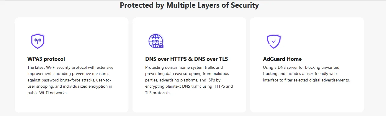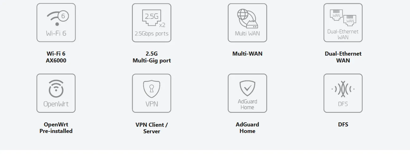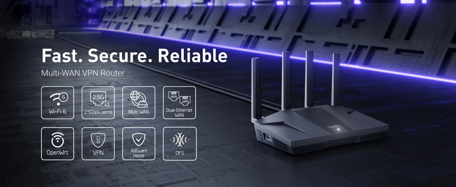 OpenVPN speed up to 190 Mbps; WireGuard® speed up to 900 Mbps Supports Multi-WAN failover and load balancing capabilities Features parental control and adGuard Home