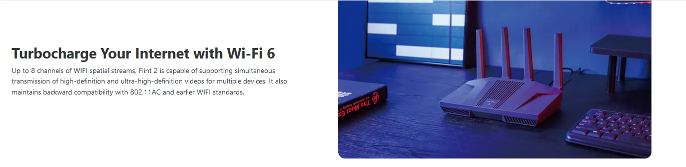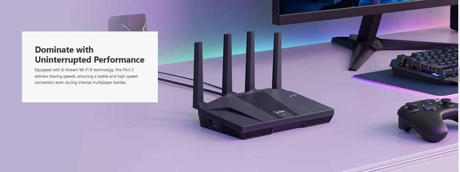 【High Speed Gaming Router】Dominate with uninterrupted performance with the ultimate MT6000 gaming internet router, equipped with 8-stream Wi-Fi 6 technology, the Flint 2 delivers blazing speeds, ensuring a stable and high-speed connection during intense multiplayer battles.