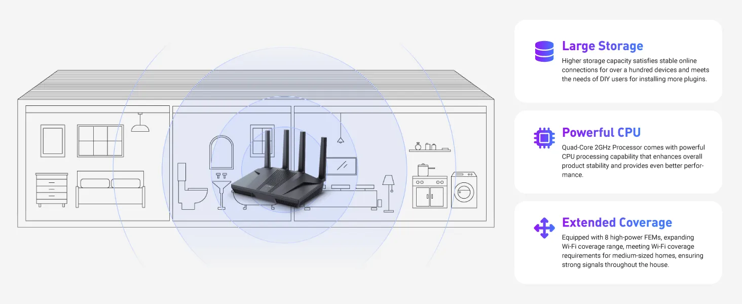 【Mass device connectivity】Experience enhanced online connectivity with our higher storage capacity, catering to over a hundred devices and fulfilling the requirements of DIY users seeking to install additional plugins. Enjoy stable and reliable connections, ensuring seamless performance and accommodating a wide range of digital needs.