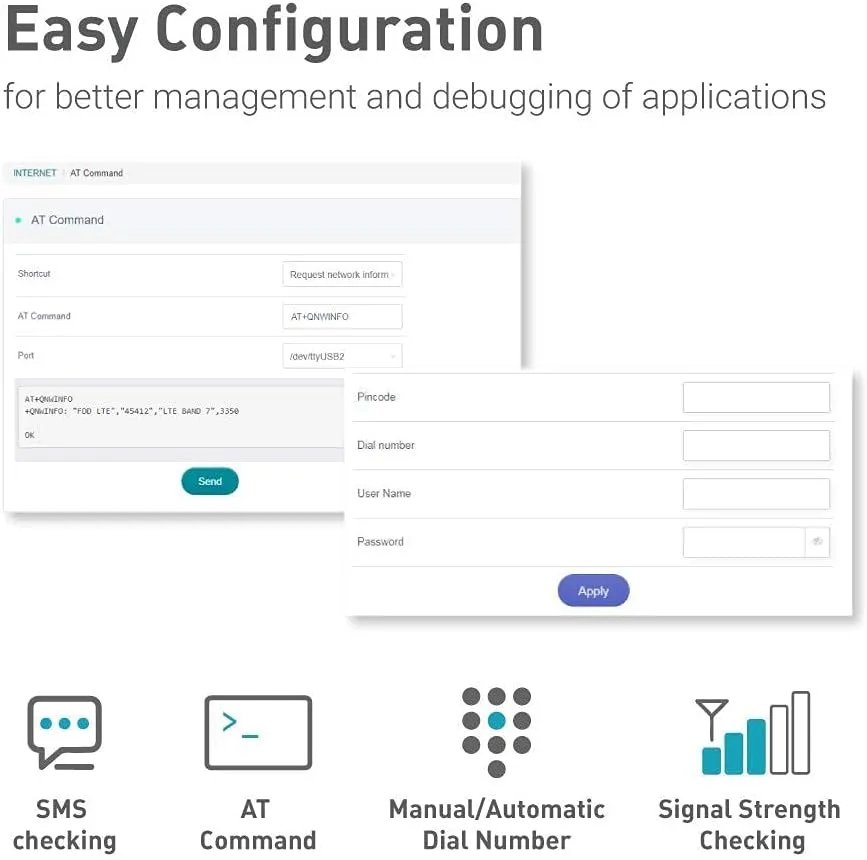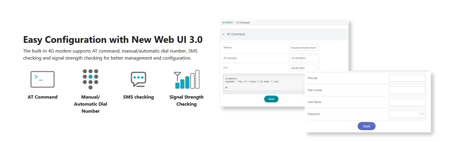 Easy Configuration with New Web UI 3.0: The built-in 4G modem supports AT command, manual/automatic dial number, SMS checking, and signal strength checking for better management and configuration.