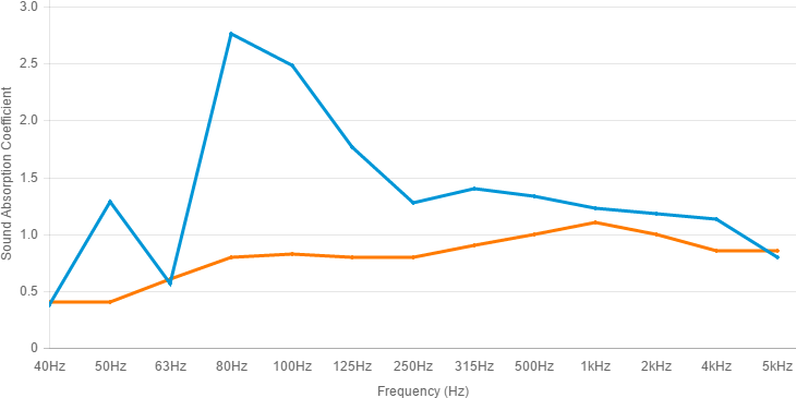 For reference, the standard Sound Absorption Coefficient wall-mount test was also performed. Although limited in scope, it provides typical data down to 100Hz and expected performance at lower frequencies as calculated by the laboratory. It should be noted that bass absorption tests are difficult to produce due to the extremely long wavelengths of lower frequencies and available room size. The tests as described above are as a result of our working with Riverbank Laboratories to deliver the most accurate findings possible given the limitations of the facility and practical mounting methods.